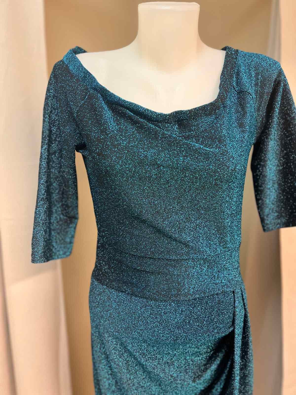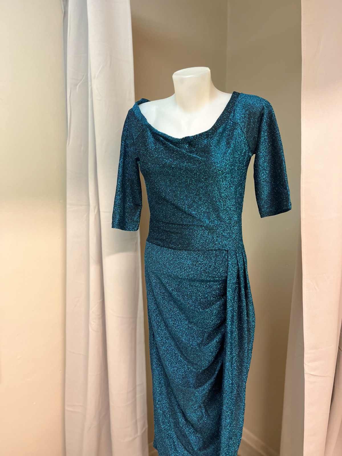 Роклята е с три-четвърти ръкави и дълбока цепка